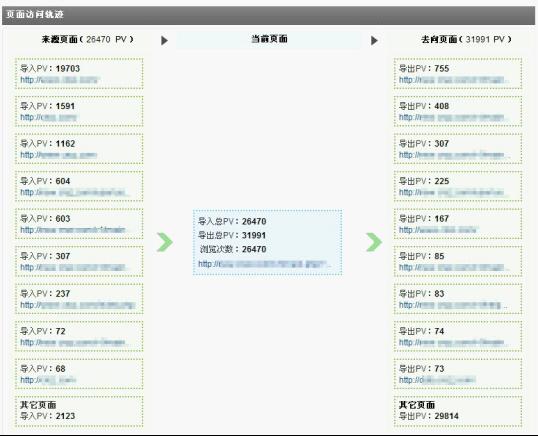 訪客經常在網站中的各個頁面之間跳轉,訪問的路徑不勝枚舉,但可以通過觀察焦點頁面及其上下游頁面,掌握訪客的來路和去向,發現較普遍的訪客訪問習慣。頁面訪問軌跡即用來完成該功能,用戶可自由指定觀察焦點頁面,系統會列出該頁面的前十位來路頁面和去向頁面。對觀察焦點頁面而言,其自身的導入、導出PV的多少能夠反映出該頁面在網站的權重地位,而通過觀察來源和去向頁面又能最大限度的了解到訪客的行為習慣及興趣點。